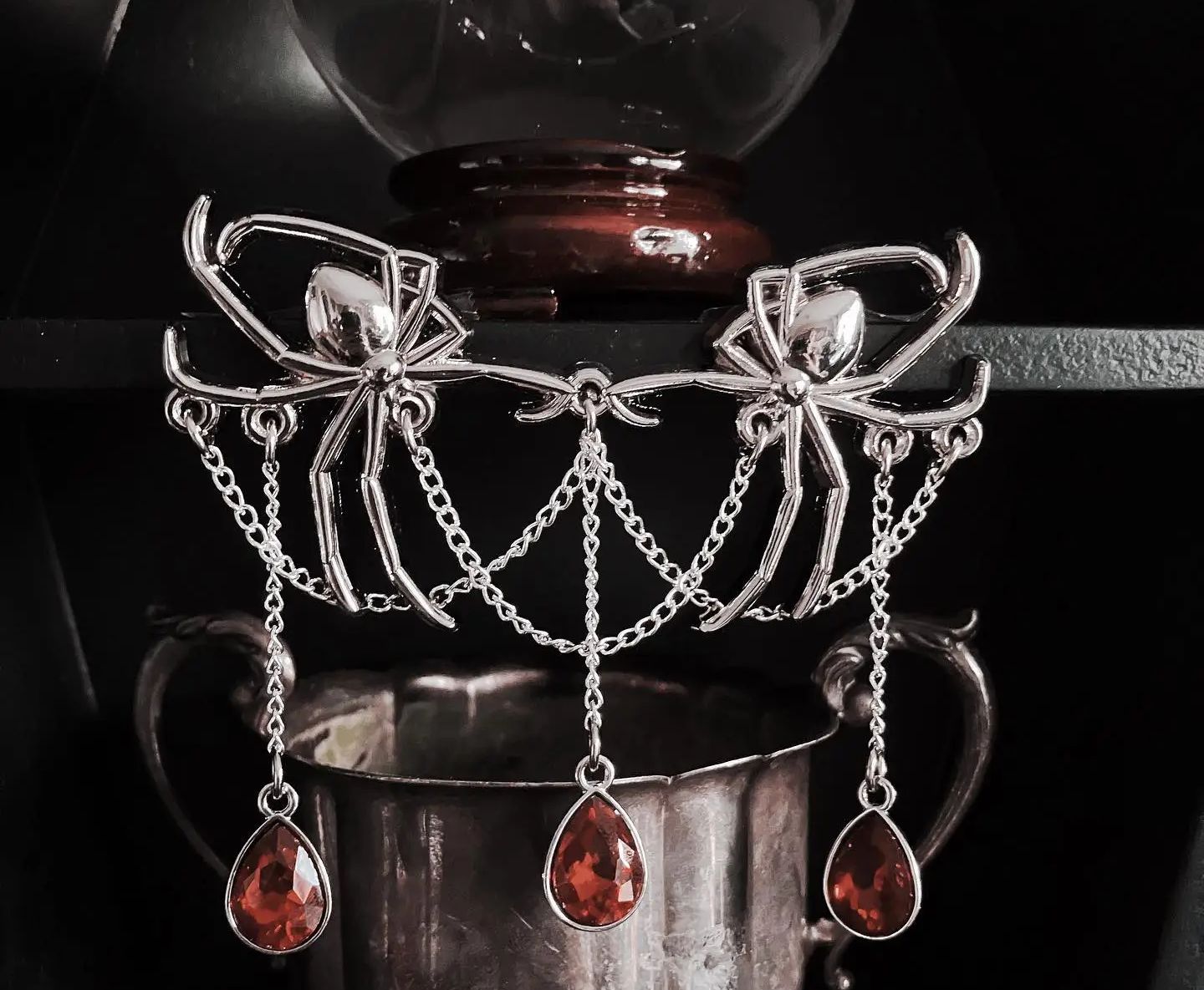 Inspired by the beauty of the Black Widow Spider, this Gothic Victorian collar pin features six chains and three blood-red droplet beads suspended from a pair of spiders, creating a stunning statement piece.