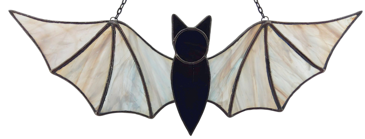 While the same pattern is used, every bat is different - even those cut from the same sheet of glass will never look quite the same. They are finished in a black patina (can vary in shade from grey to black to bronze) and polished with carnauba wax. There is a wire embedded in the solder along the top, to provided strength and prevent bending.