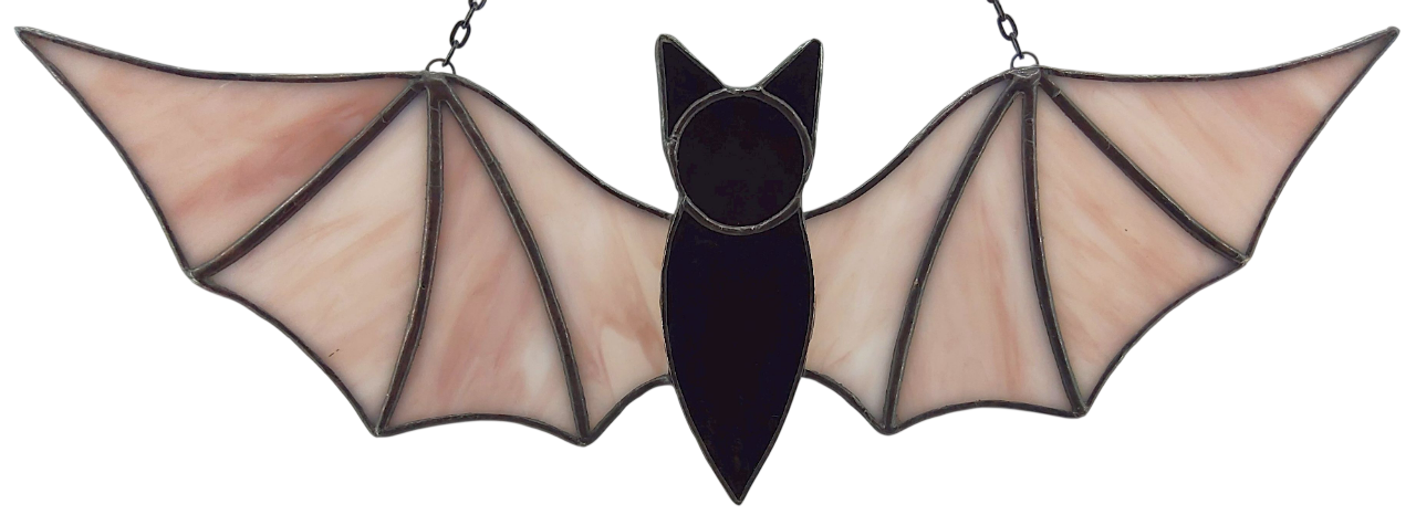 While the same pattern is used, every bat is different - even those cut from the same sheet of glass will never look quite the same. They are finished in a black patina (can vary in shade from grey to black to bronze) and polished with carnauba wax. There is a wire embedded in the solder along the top, to provided strength and prevent bending.