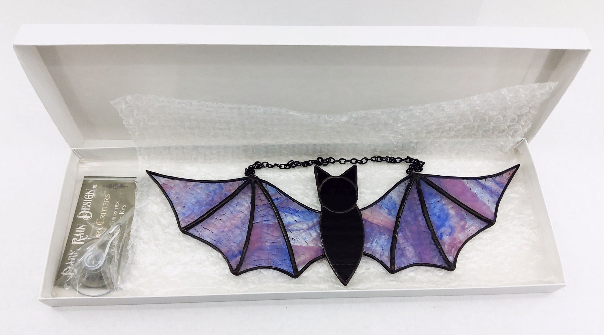 The piece is approximately 11½" wide and 3½" tall. It comes with black chain attached, and is packaged in a white box for presentation, along with a heavy-duty suction cup for hanging. If the bat is going to be hung in direct sunlight we recommend hanging from the window frame instead as the suction cup can slide (and anyway, bats don't like bright light). Command hooks also work.