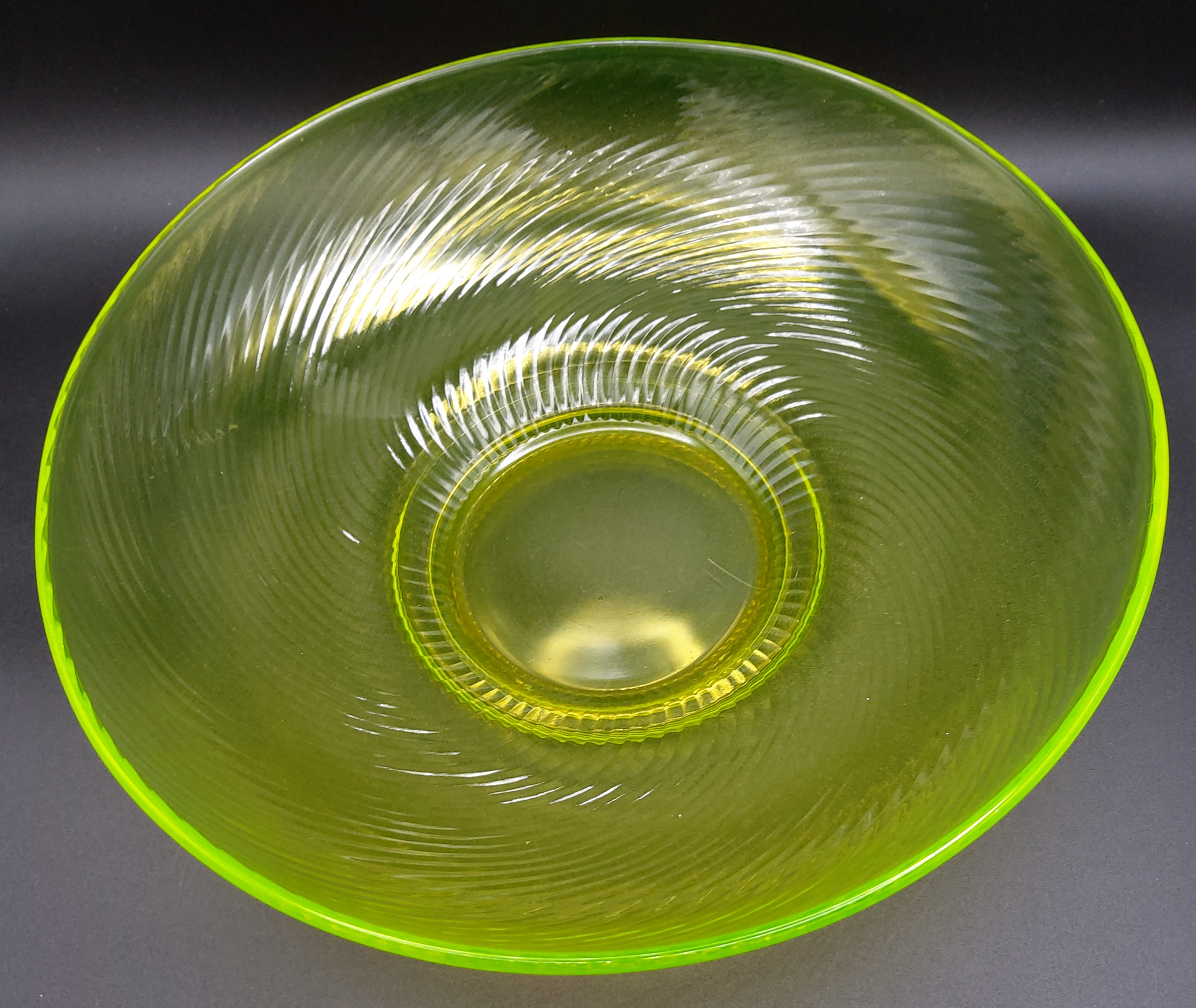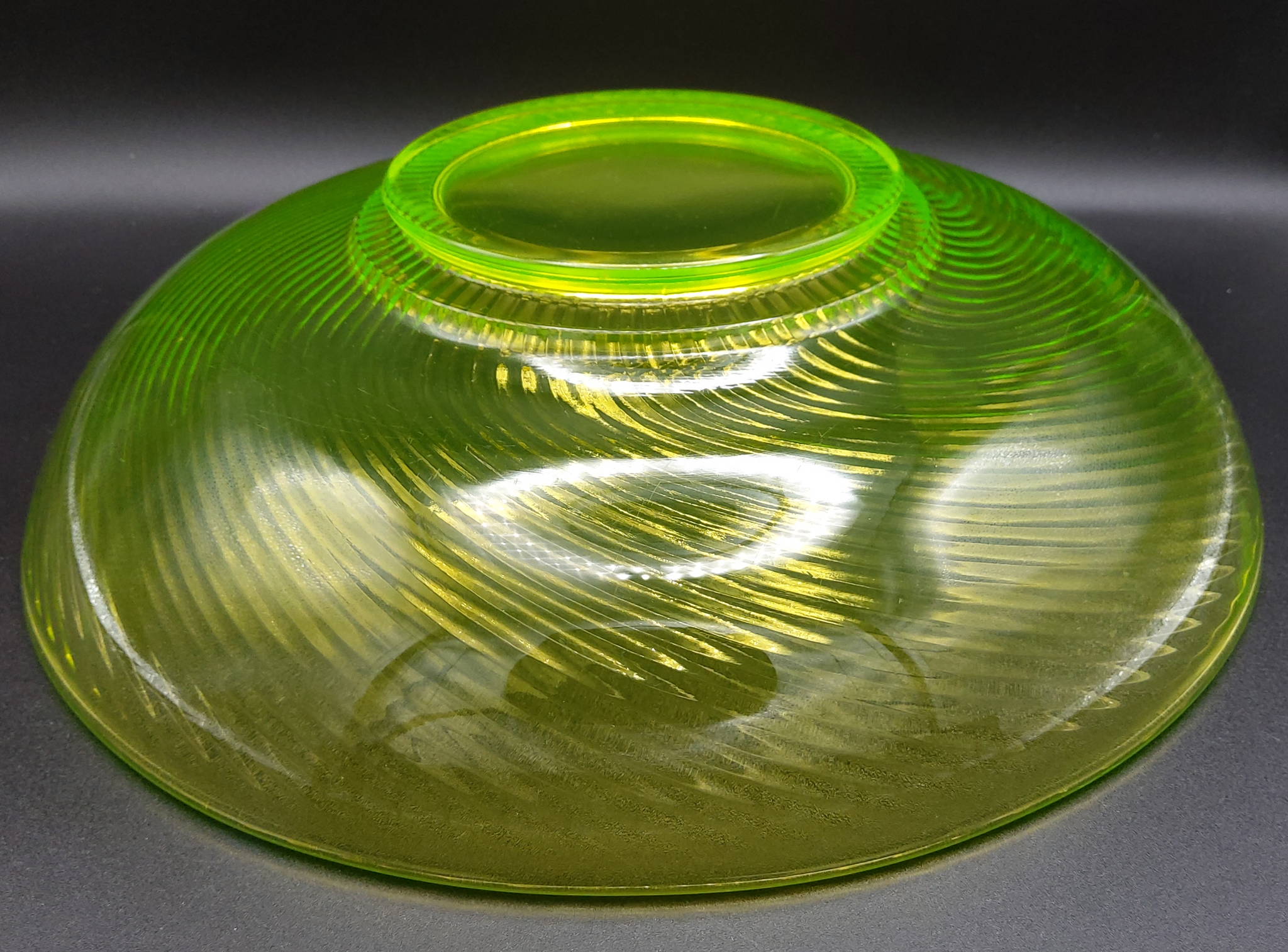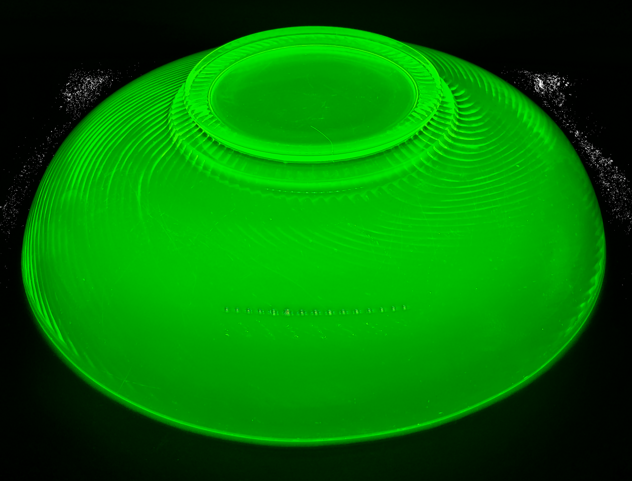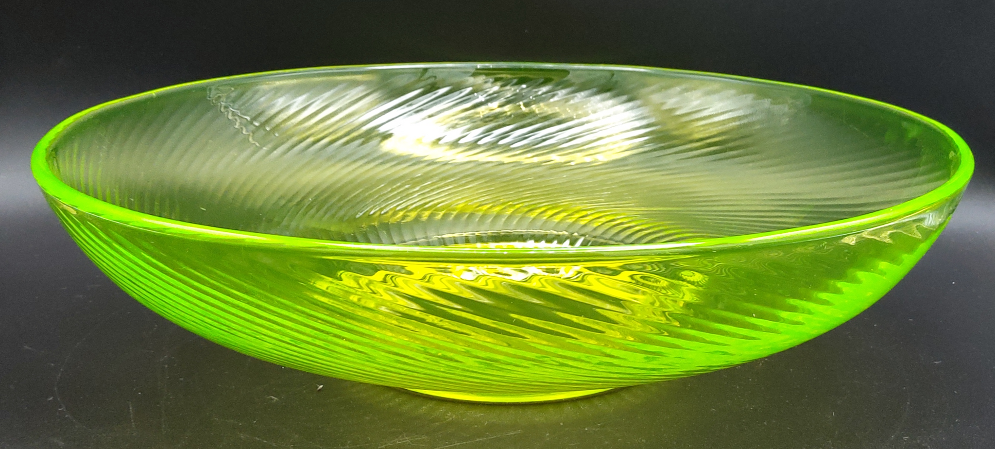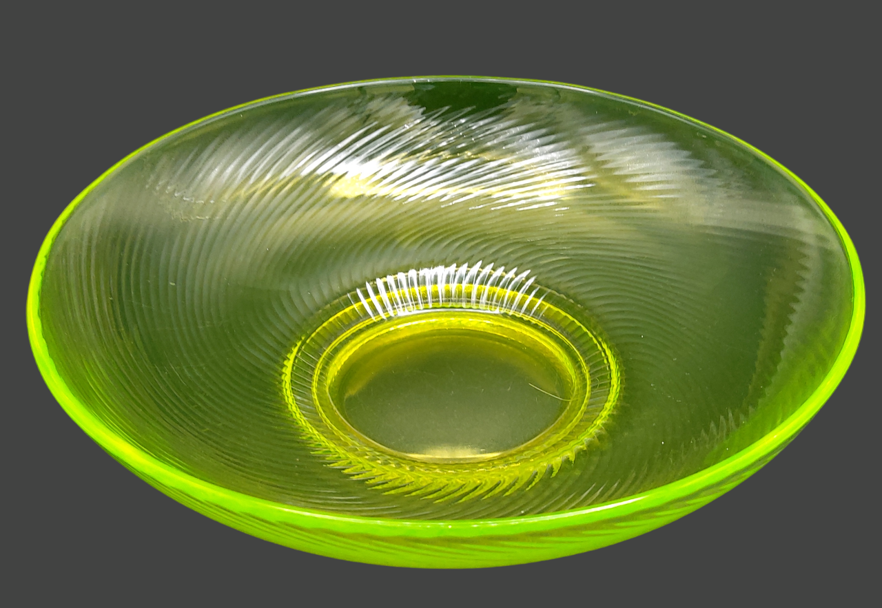 This brilliant yellow glass bowl almost glows in regular light, and has a phenomenal glow under the black light. Not one flea bite/chip/crack, just mild surface scratching.