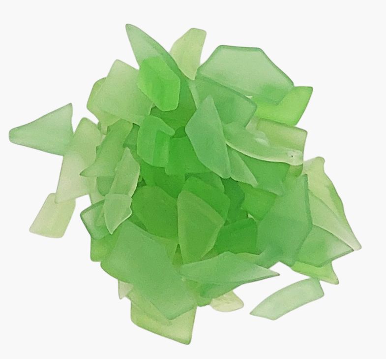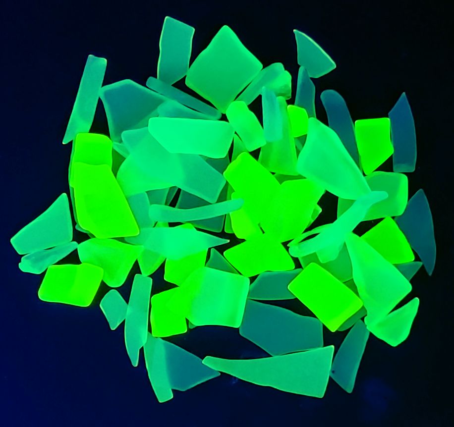 ¼ pound of real uranium glass chunks. These are typically from our regular vintage items that have met with unfortunate accidents either transporting or displaying them ("Gravity, thou art a heartless bitch.") Rather than wait for Mother Nature to do the job of smoothing those sharp edges, we toss 'em in a rock tumbler for a week to get the same finish.