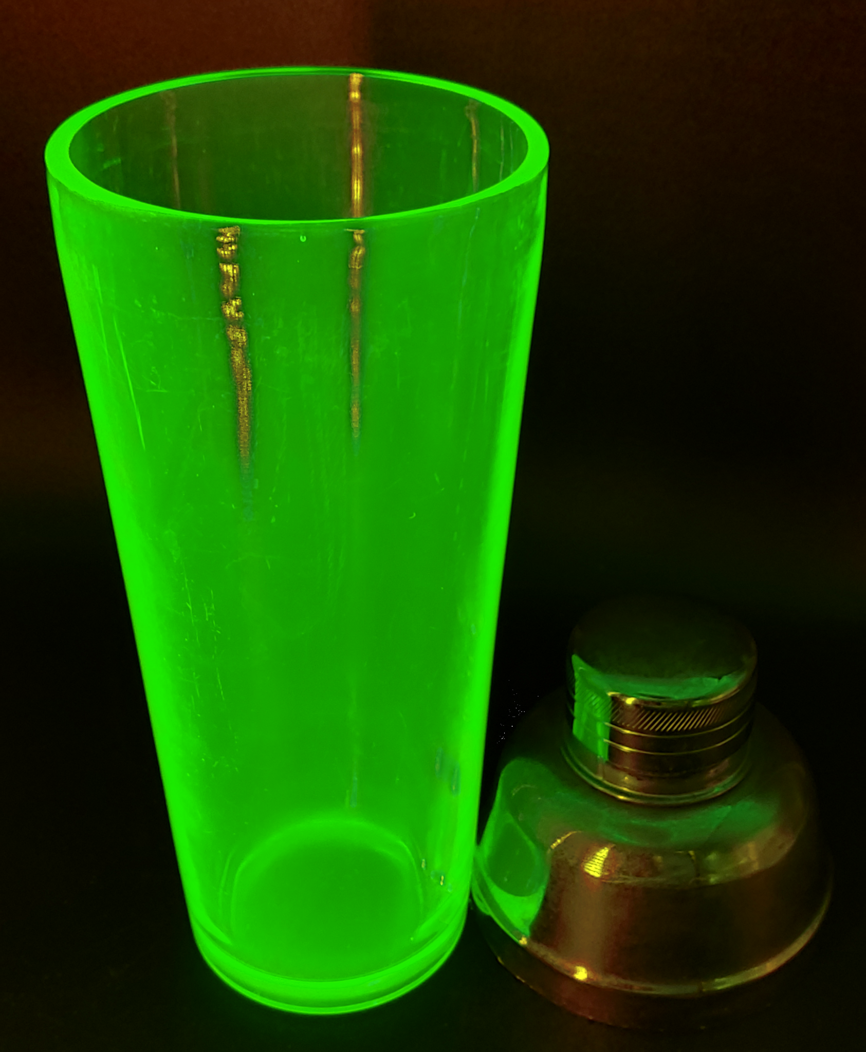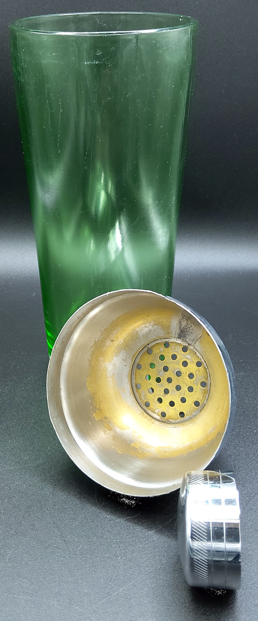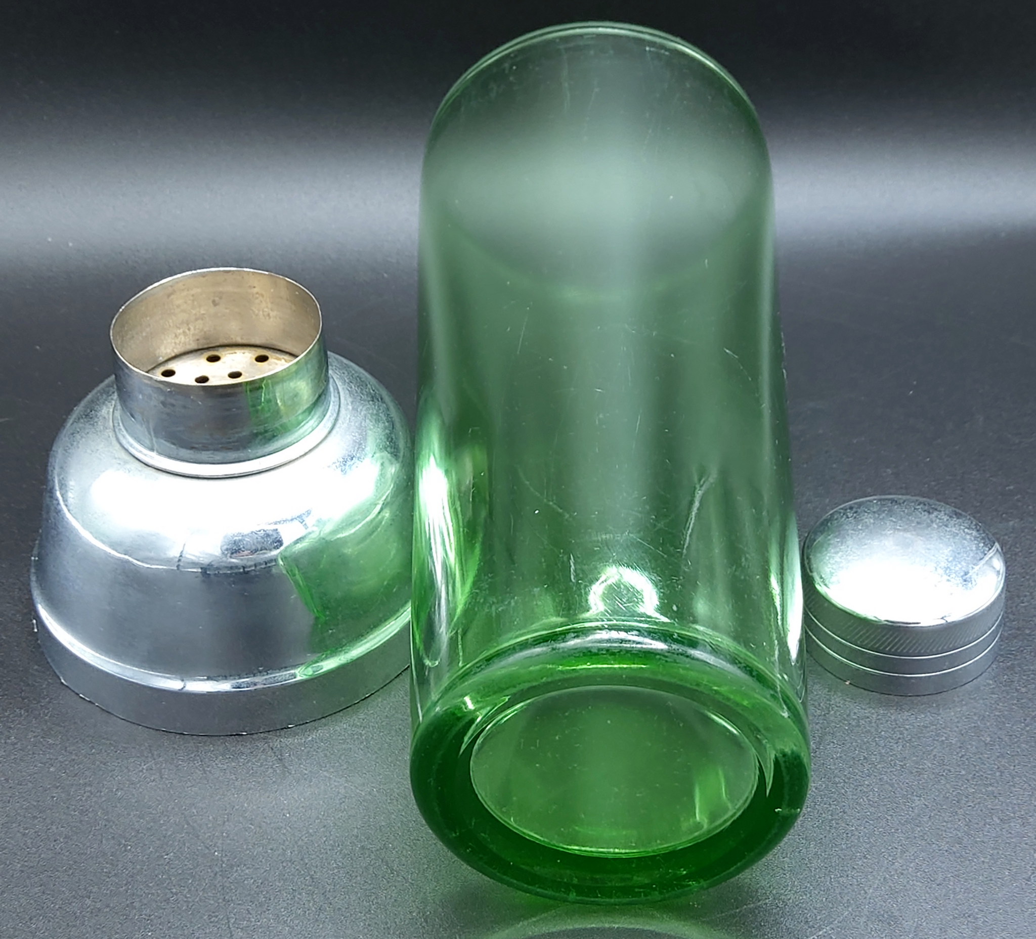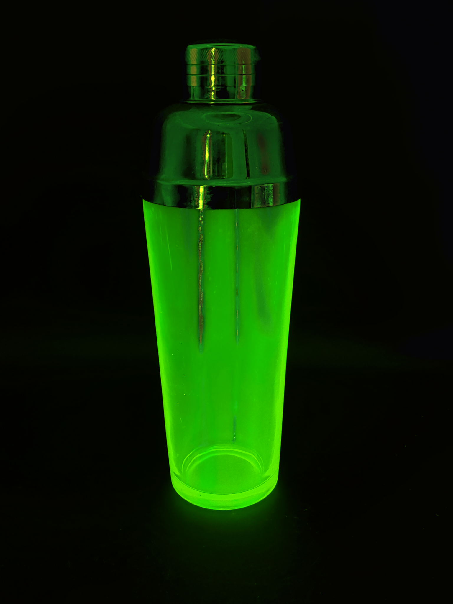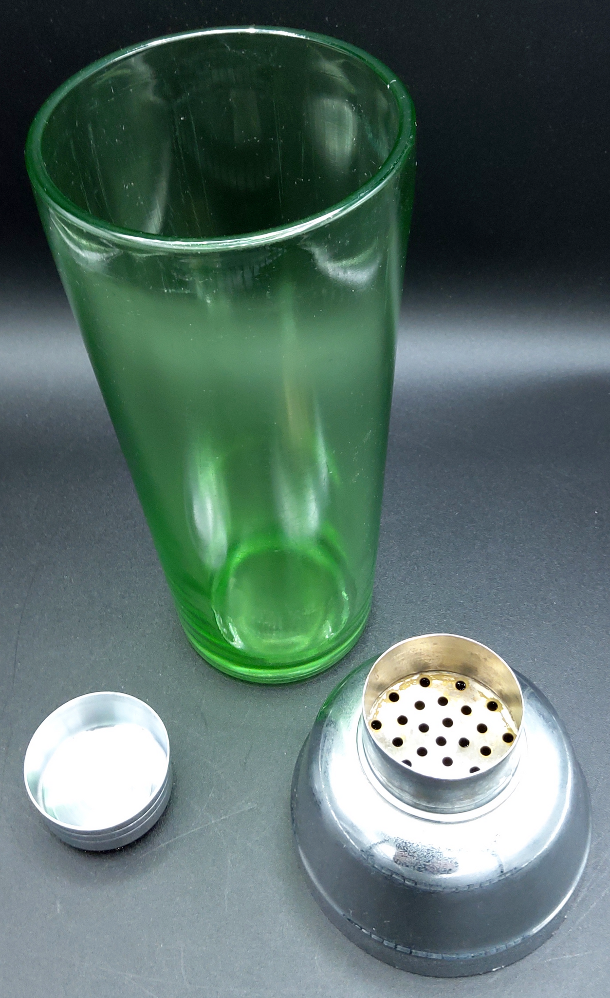 Rare! Uranium glass cocktail shaker with metal top and strainer!